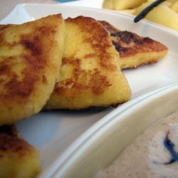 Картофель очистить, сварить, добавить яйцо, хорошо вымешать. Лук мелко нашинковать, поджарить, смешать с рубленой петрушкой и вареным саго. Картофель разделить на две части, сделать две лепешки, на их середину положить фарш, соединить края, обвалять в муке и поджарить. При подаче на стол полить сметаной. Картофель —300 г, лук репчатый — 25 г, саго —300 г, яйца — 2 шт., мука—15 г, масло сливочное — 7 г, масло растительное — 7 г, зелень, соль по вкусу.