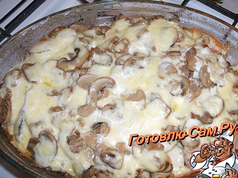 Нарезать куриную грудку и приправить по своему желанию. Картофель и морковь нарезать кружками. Промыть грибы и дать воде стечь, затем нарезать. Форму для выпекания смазать подсолнечным маслом и посыпать панировочными сухарями. На дно добавить несколько столовых ложек сметаны, затем слой картофеля ломтиками, ломтики моркови, кусочки куриной грудки и грибы в конце. Сверху добавить несколько столовых ложек сметаны и посыпать тертым сыром, а затем внести в духовку на 30-40 минут.