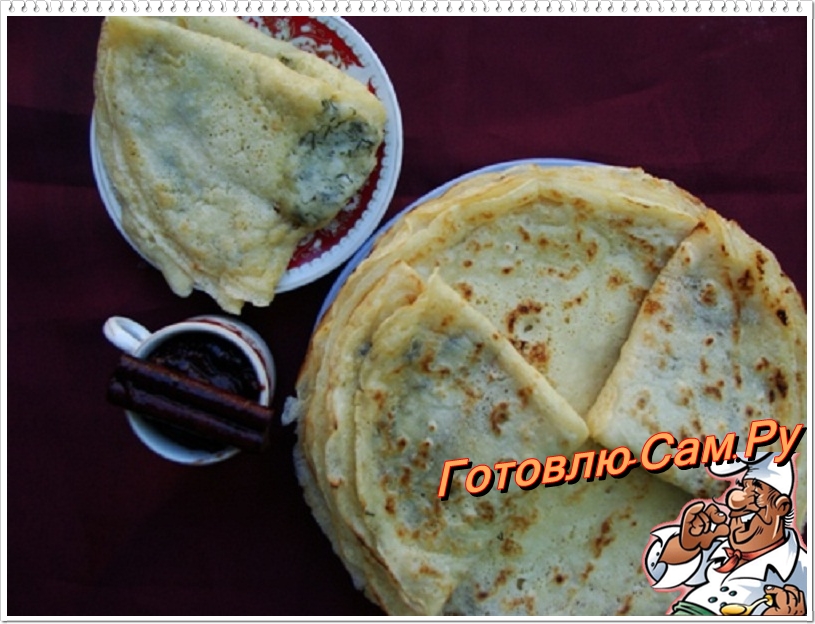 Тесто: Поверх муки влить молоко и добавить соль, перемешать. Затем добавить понемногу минеральной воды, перемешать. Тесто должно быть без комков. Под конец добавить взбитые яйца.