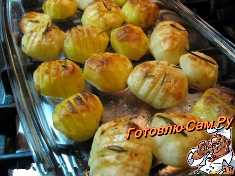 Почистить и промыть картофель, затем разрезать их, но не до конца. Смазать форму растительным маслом, уложить туда картофель и приправить солью, перцем и посыпать розмарином, и добавить немного растительное масло. Выпекать на среднем огне в течение 20 минут до румяной корочки.