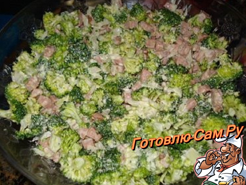 Брокколи нарезать мелко. Лук нарезать мелко и добавить к брокколи (хорошо перемешать вместе). Оставить прикрытым на ночь в холодильник. На следующий день, поставить на огонь сковороду, добавить оливковое масло и обжарить ветчину (мелко нарезанную). После того, как бекон обжариться, добавить все к брокколи. Поставить на холод (30 минут). После охлаждения добавить майонез, 1 столовую ложку сметаны и 1 чайную ложку лимонного сока, приправить.